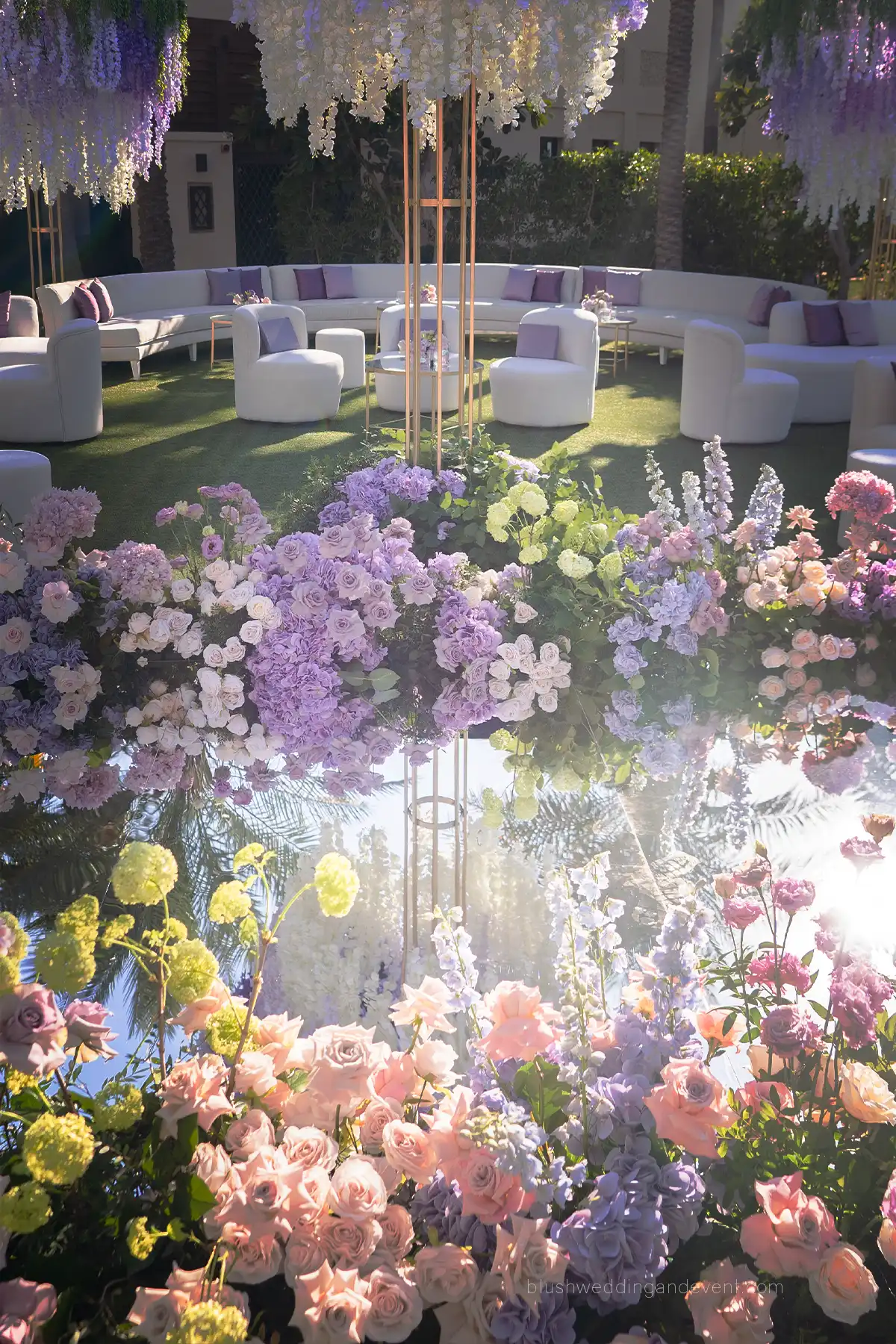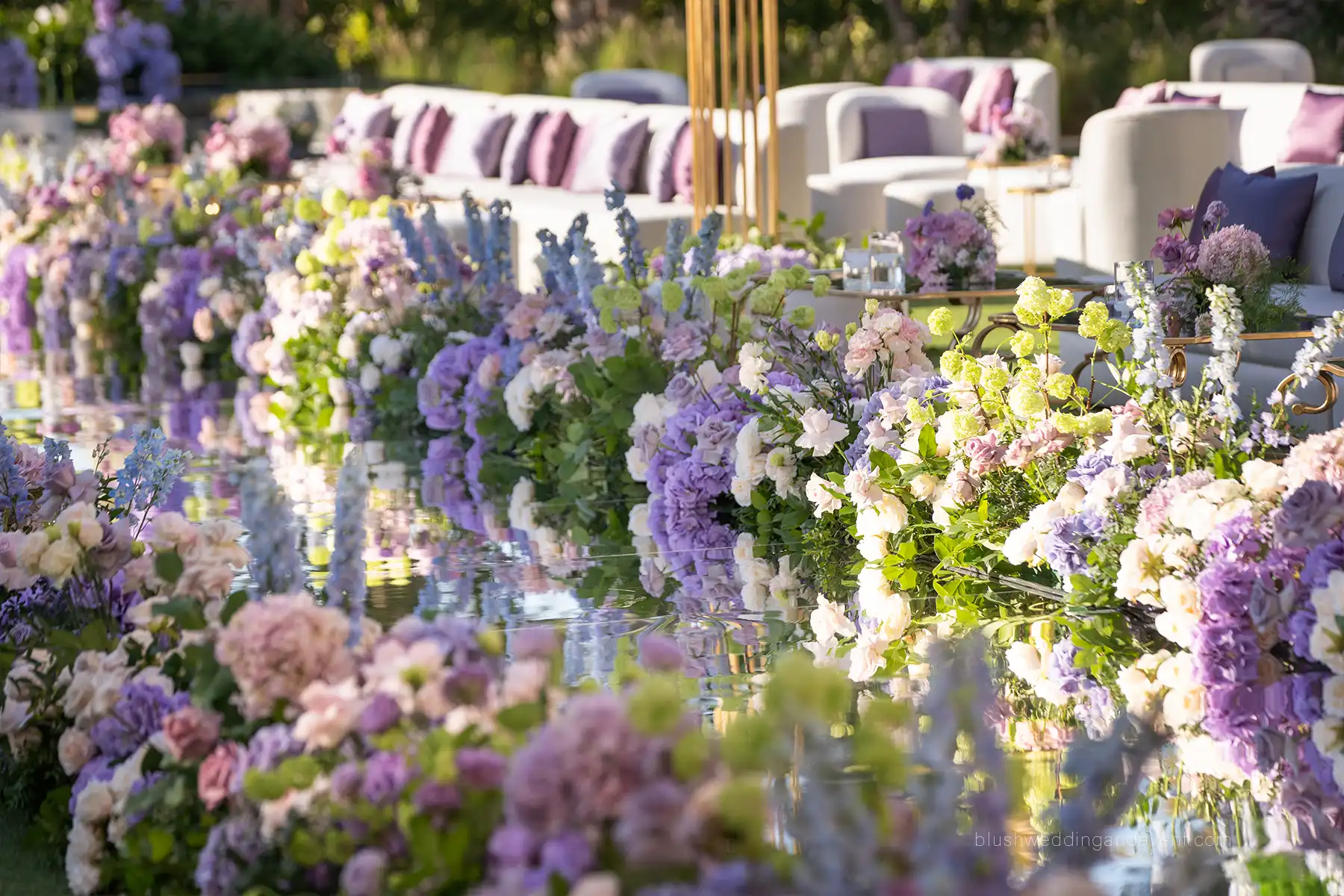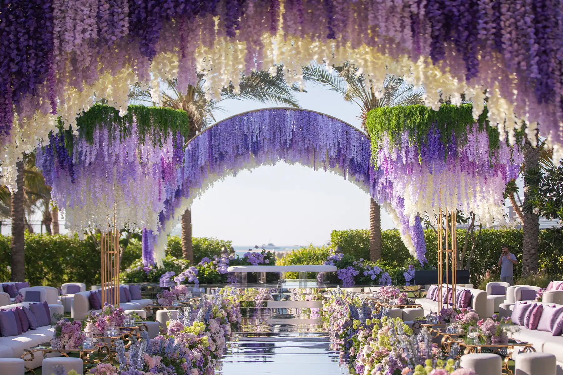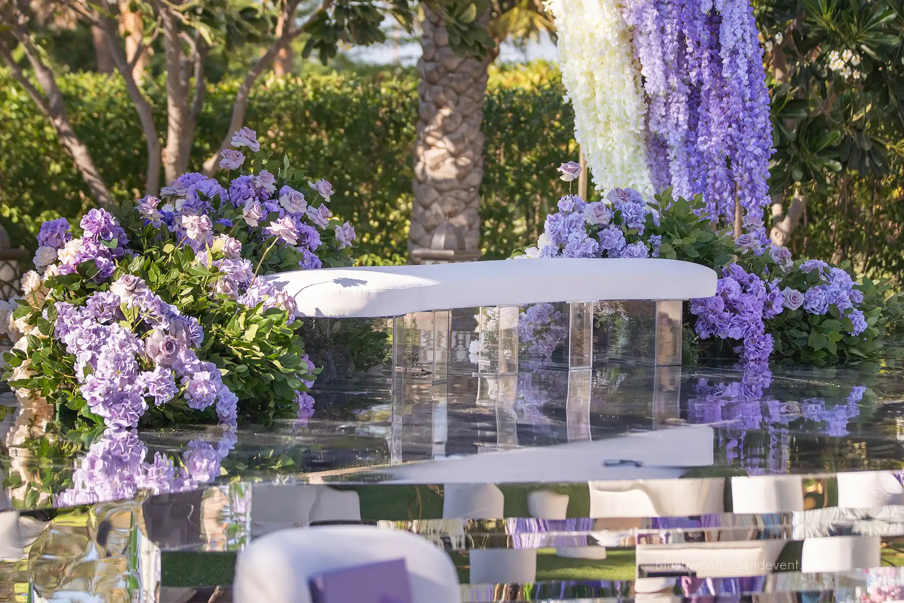 A celebration shaped by light, color, and reflection. The floral palette flowed through shades of purple and blush pink. Guests entered a setting framed by the ocean and surrounded by trees of flowers rising high above them. The mirrored flooring reflected the blooms like an endless garden, creating a sense of floating between earth and sky.