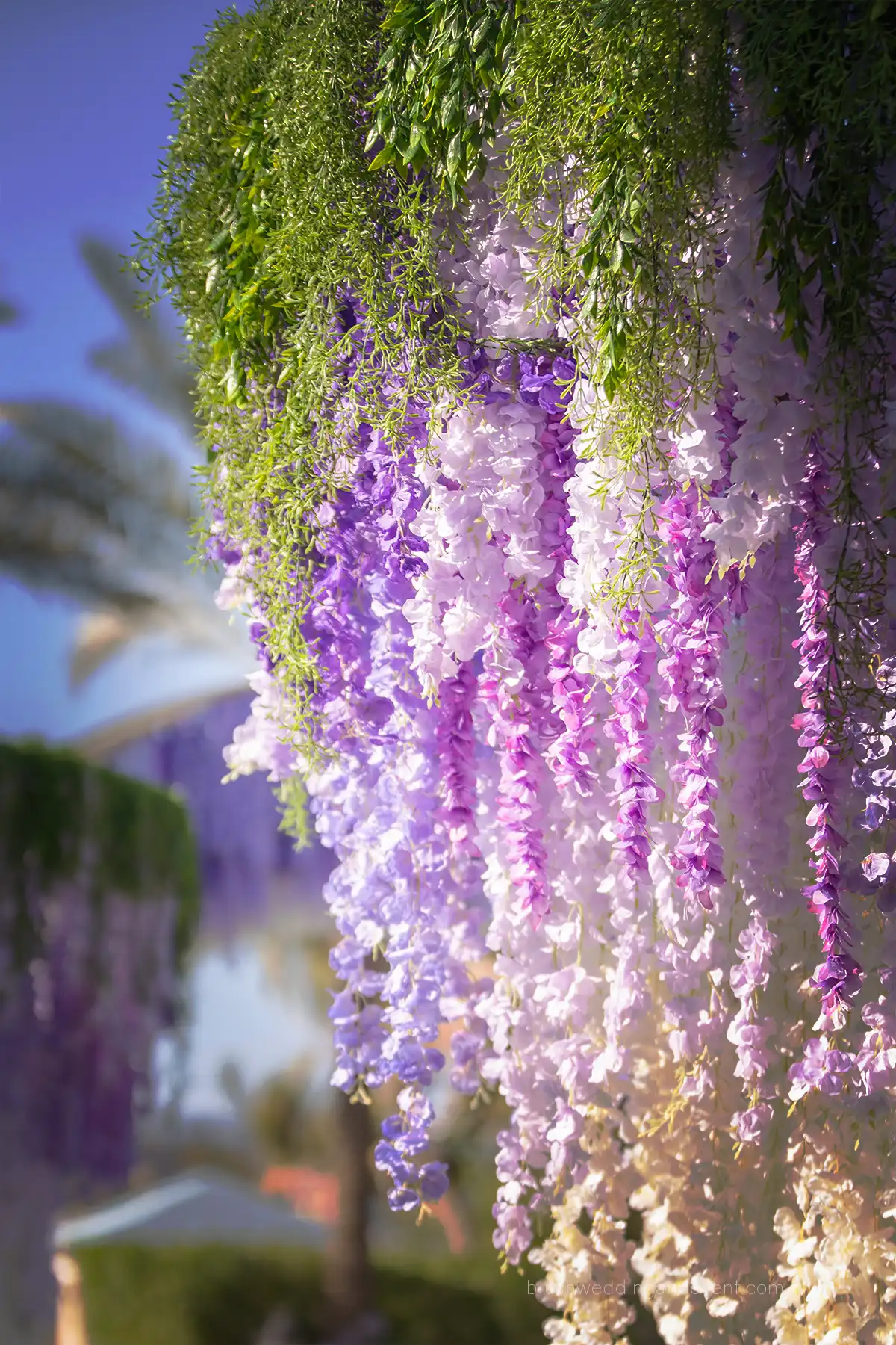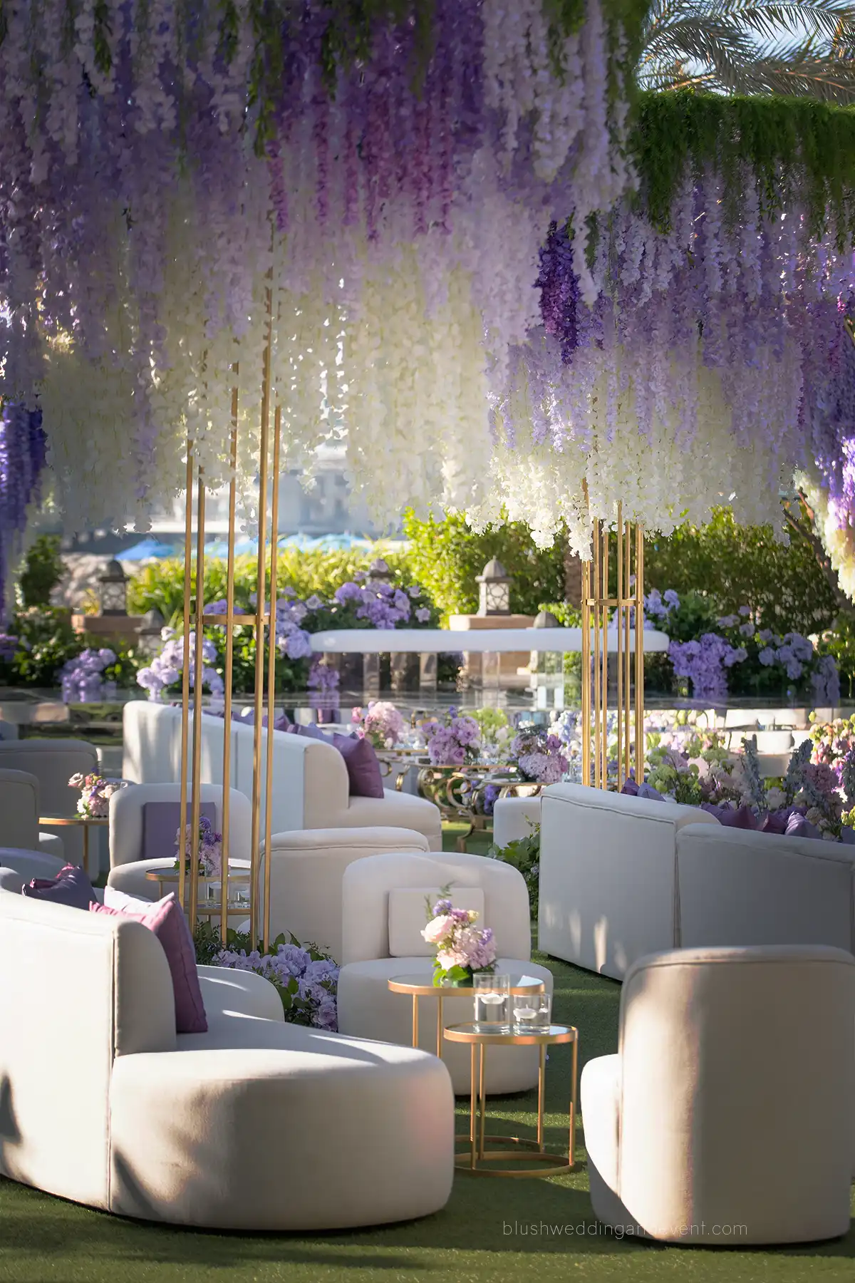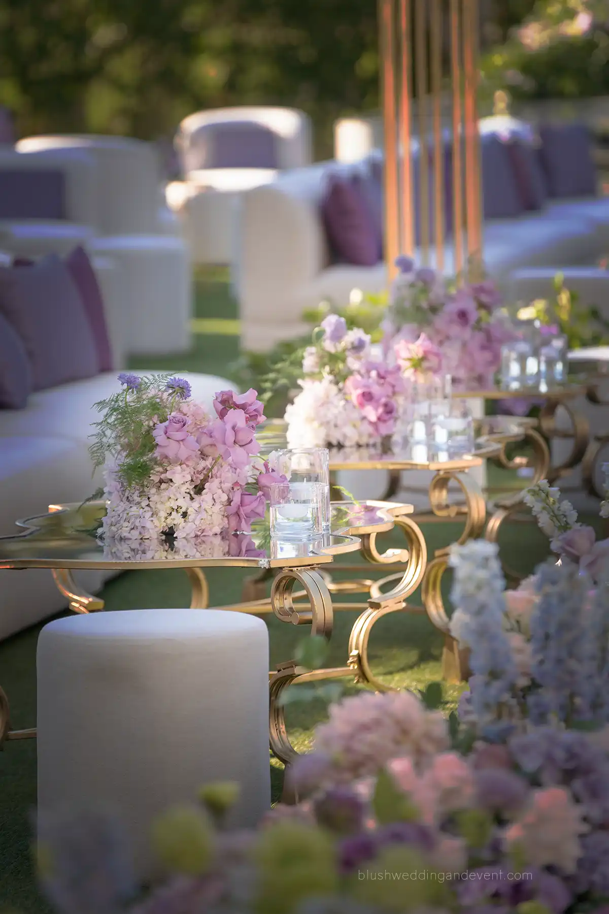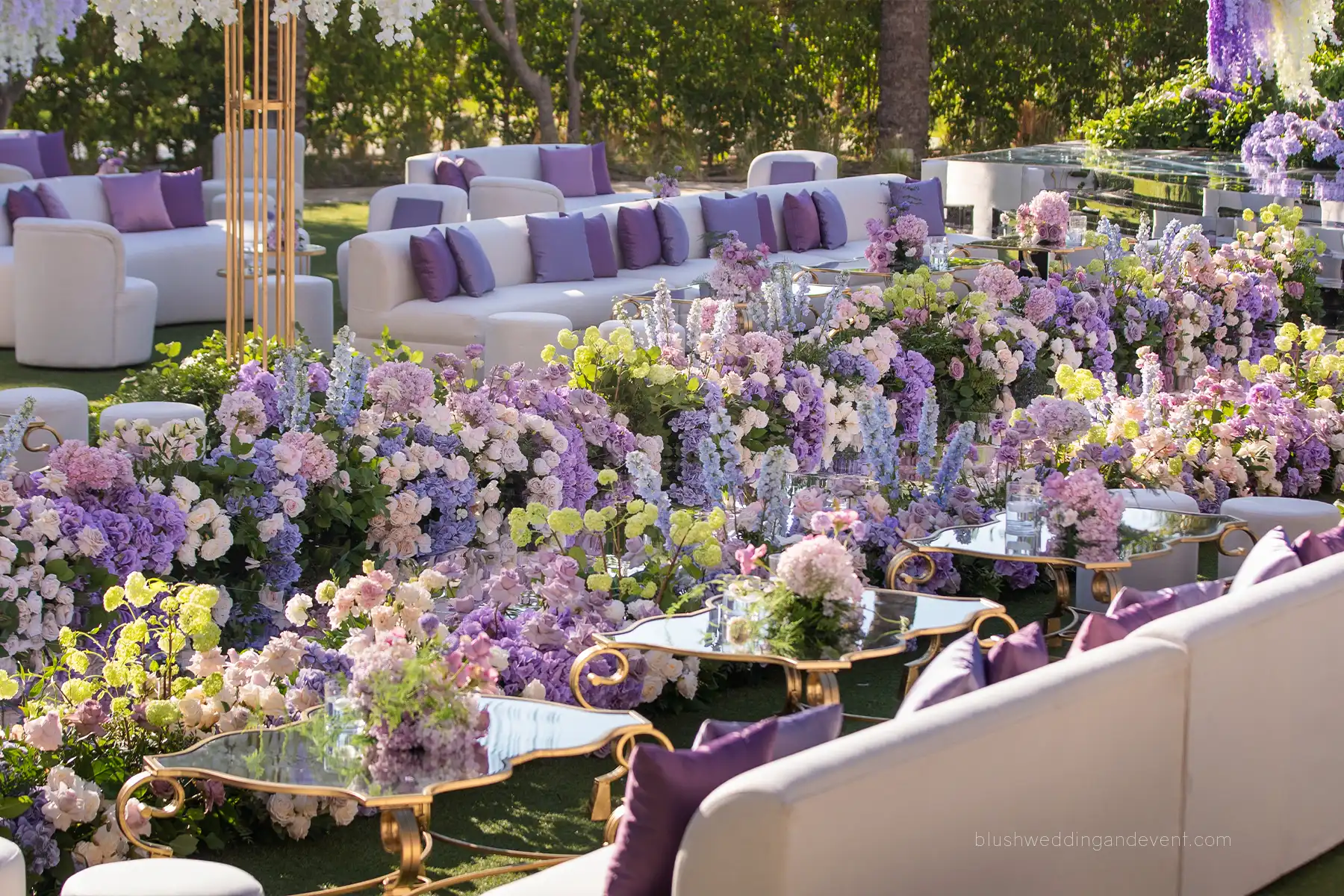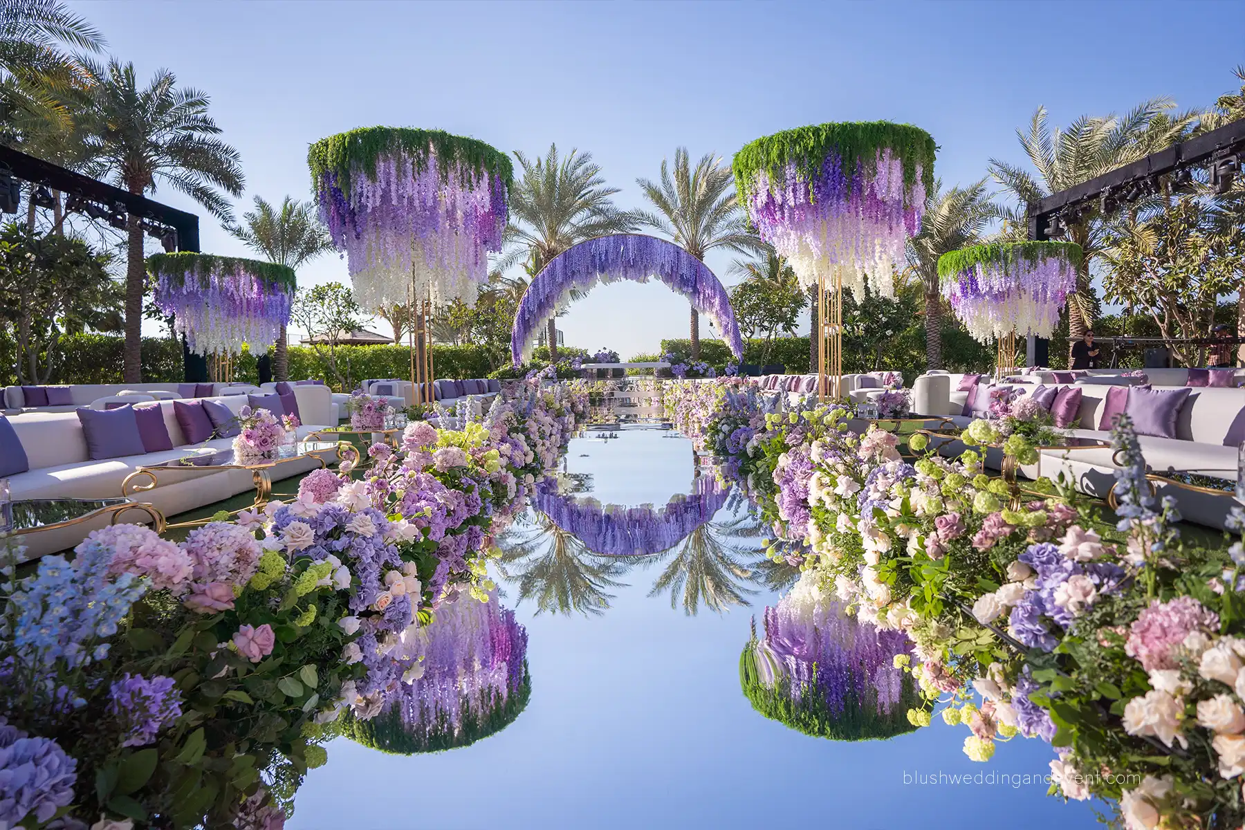 A celebration shaped by light, color, and reflection. The floral palette flowed through shades of purple and blush pink. Guests entered a setting framed by the ocean and surrounded by trees of flowers rising high above them. The mirrored flooring reflected the blooms like an endless garden, creating a sense of floating between earth and sky.